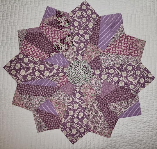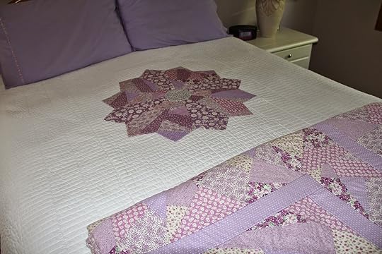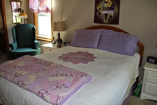 A few months before this, I had spotted this great template called Fats Cats. It helps you make large Dresden plate designs quickly. After I made the Dresden plate, crazy quilted and all, I appliqued it to the pre-quilted bedspread. Such an easy and quick project. To tie it all together I folded my winter purple bedspread at the end of the bed.