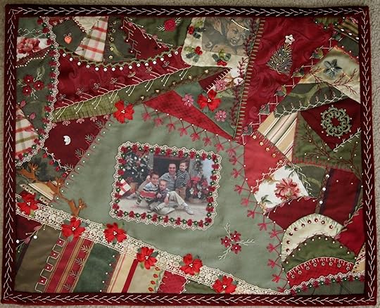 My Christmas Dream, by Valerie Bothell, 2014I ended up doing a fold over binding in velvet to finish the edges and did a feather stitch in gold thread all the way around it. I think you can click on the image to enlarge it to see the detail on the edge. I decided to not add a fancy border because I didn't want anything to distract from my favorite part of the quilt, the picture of my 4 boys. This is a wall hanging I will always treasure......