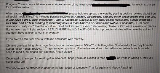 This email was posted to Twitter this morning, and the reviewer in question was kind enough to remove the identifying details. As a former pro reviewer and self-published author myself? I would never have been so kind.