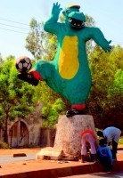 We continue north past the now defunct Bamako train station to Bamako’s National Museum whose main attraction is beautiful air-conditioning. We enjoy it for as long as possible while nibbling on a lunch of club sandwiches and OJ). There are two main exhibition rooms in the museum. The first houses a temporary display of Malian furniture that Christi adored. The main permanent exhibits are of some fantastic Telem terracotta statues, Dogon masks, and many different examples of Malian textiles. Later that afternoon the Adonis drives the Dragoman truck to the museum and the rest og the group join Christi and I to listen to a free concert given by Lobi Traore (La Bambara Blues Maestro) who plays some very smooth blues music. (note sadly, Lobi Traore died in Bamako some 4 months after our visit) Traffic congestion after the concert is unbelievable. We drive 1 mile in one hour and walk a second mile back to the Sleeping Camel in 20 minutes.