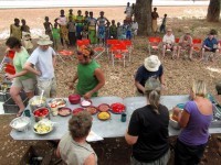 Tonight Christi is cooking together with a rather sanguine and bruised Hu-man. Christi finds the prospect of cooking for such a large group of people under such primitive conditions to be quite stressful. But in the end their sausage casserole is delicious as is the mango we have for dessert.