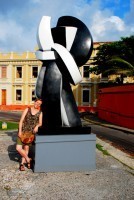Christi leads us on a self-guided tour of Old Town Cartagena today. We begin by walking to the Puerta del Reloj and Plaza de los Coches, which is to say the main gate where 11 million slaves arrived over a 300-year period. The slaves were sold in the plaza. There is a statue of Pedro de Heredia in the plaza (the founder of Cartagena in 1533) and beside this benevolent figure there is one of a number of horrible modernist, abstract sculptures that now dot the Old Town – all the work of Sophia Vari (Mrs. Fernando Botero). And the big question is why? The Old Town is in perpetual renovation and our next stop, Plaza de la Aduana, is under scaffolding. Beyond that is Convento and Iglesia de San Pedro Claver. It was an impressive façade and a colorful dome behind. Pedro Claver, a Spanish-born monk, dedicated his life to ministering to the slaves imported from Africa. He was the first person to be canonized in the New World (in 1888). We’ll tour this church another day.