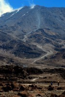 After a nervous night we awake to find the montane rainforest below us enveloped in a sea of cloud. We have an early morning start for Kibo hut at the base of the main Kilimanjaro crater. It’s a 6-mile hike across alpine desert (like a lunar or martian landscape). A cold wind blows; it’s a bleak and desolate landscape. And the further we walk the larger Kilimanjaro looms above us. We arrive at Kibo hut at 1.30 pm, 5 hours after departing Horombo campsite. For once we are a little quicker than the average. Kibo hut is at the rarefied altitude of 15,430 feet. The hut is divided into a series of 12-bed dorms; Christi and I share our dorm with a party of very confident German climbers. We have 10 hours to kill before we begin our summit push. There will be no sleep tonight. As usual Charles, Henry, and the porters disappear and only reappear to feed Christi and I. We try to relax, but we feel nervous. We eat a little, checks our packs and equipment, and wait. And wait.