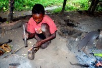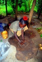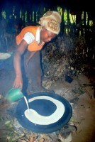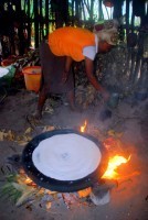 The Ari inhabit the area around Jinka. They number about 100,000 (compare this to the Mursi who number only about 5,000) and are the group that have become most assimilated into the modern world. We visit the nearby Ari village of Rocky on our way to Turmi (in Hamer territory). It is another wet and cold day, but the Ari are very friendly and inviting and Christi and I are welcomed into the village. I think our driver-guide Fekade pays an entrance fee to the village chief, but I never see any money change hands. I have to give Fekade yet more praise here, because while Christi and I explored Jinka market yesterday, he scoured the town looking for 1 Birr notes to pay for the hundreds of photos I am taking. I think you could spend an entire lifetime in this area taking photos and learning about the various tribes and their cultures. You probably won’t be surprised to learn that this trip to the Lower Omo Valley already rates as my favorite experience in Africa. The Ari are happy to show us some of their traditional lifestyle activities (I wonder what the locals think about our interest in these things. I mean would anyone pay to watch me wash my car or Christi vacuum our apartment in San Francisco?). We wander around the rain-sodden village (in the company of another large crowd – it’s hard not to feel a little like a celebrity) stopping at different huts to watch a pottery demonstration, a blacksmith at work, and preparation of injera (the national dish).