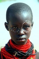 As usual Fekade approaches the village chief asking for permission to visit the village and once a ‘present’ exchanges hands Christi and I are free to wander around. The village of Korcho lies on a bluff above the Omo river, which Christi and I are seeing for the first time. It may not have the fame of the Amazon or the Nile, but without it the complex melding pot of ethnicities would not exist in this area. The Karo are friendly and much like the Mursi eager to be photographed. Okay, that might not be entirely true, but they know that they only way they can earn money is by posing before the camera. And sometimes they go to ridiculous lengths to attract my attention: the girls all pose topless (which does get my attention), while others paint their bodies (the Karo are famous for their body painting using white chalk, which they do normally in preparation for dances, feasts, and celebrations). Many of the young women have a pierced lower lip with an inch-long nail protruding. And yet others have short hair dyed red, the result of mixing animal fat and the pigment ochre.