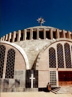 While we wait for news of our Omo Valley excursion, Christi and I finally flag down a tuk-tuk for the short ride to Debre Birhan Selassie (Trinity at the Mount of Light) Church, 2 km north-east of Gondar. This church is arguably the most famous in Ethiopia, although not for its exterior appearance, which is a bland rectangular box dating to the reign of Yohannes I (1667-1682). The interior murals are, however, truly magnificent. It has even been suggested that the church was built specifically to house one of the most iconic of religious artefacts, the Ark of the Covenant. The Ethiopian Orthodox Church would have you believe that the Ark is in fact currently displayed in a church in Axsum, but since only monks are allowed inside, believers have to take this claim on faith. The interior artwork of Debre Birhan Selassie Church is attributed to the 17th century artist Haile Meskel. There are depictions of Mohammed, emperors, hell, Saint George and the Dragon, but his most impressive work are the winged angels that adorn the ceiling. Each has a different, enigmatic, appearance and some wag coined the phrase the African Mona Lisa’s – all 104 of them.