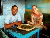 There are two draw cards for Gondar: one is as a base to organize trekking expeditions into the Simien mountains (which we have done previously and which are quite spectacular). The other and much easier to organize is a visit to the castles of the Royal Enclosure, located in the center of town. Before we take a lazy stroll through the African Camelot, though (and who knew there were castles in Africa. Well, OK, we did because we have been here before. But prior to that visit we had no idea) the idiosyncrasies of the Queen Taitu hotel (smelly bathroom, no hot water, alternating TV stations) proved to be, well, too idiosyncratic for us. So we move to a hotel aimed at backpackers that has just opened and recommended by Explore Abyssinia Travel yesterday. It seems to me that Ethiopia is changing fast. It is becoming more of a destination so if you want to see this pristine country go now before it’s too late. Enough proselytizing – alright just a bit more – Ethiopia is our favorite country in Africa (There, we’ve said - now on with the story). Our new hotel, the recently opened Lodge du Chateau, is run by Sayoum – who just happens to own Explore Abyssinia Travel (a sneaky piece of self-promotion that). In fact I think this hotel is so new that we are among its first guests! Anyway, he has the latest copy of the Lonely Planet Guide to Ethiopia, which he lends us. We pour over the latest information with relish as we eat an early lunch at the Golden Gate Asian restaurant. The restaurant even has a large photo of the Golden Gate Bridge as its center piece. Sad to say the food is terrible, but then why on earth are we eating Asian food in Ethiopia when Ethiopian food is so tasty and so unique.