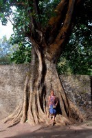 We end the day at Fasiladas’ Baths. Named after the famous 17th century Ethiopian Emperor, Fasiladas is credited with founding the city of Gondar in 1636 and establishing it as Ethiopia’s capital. He later built these public baths to celebrate the festival of Timkat. Timkat is the Ethiopian Orthodox Church’s celebration of the Epiphany (that is the baptism of Jesus in the Jordan River). Fasiladas’ Baths features a two-story brick building surrounded by a moat. During the festival of Timkat, models of the Ark of the Covenant are paraded around Gondar and the procession ends at the Baths. The moat is specially filled for the occasion and after the priests bless the water the local jump in and a party atmosphere takes over. The festival of Timkat occurs in January, but Christi and I visit in June, which probably explains why the place is deserted. The Baths are also in the midst of being renovated. This 3-year project is now into its sixth year and appears no closer to being finished. Much of the stone structure is encased in rickety wooden scaffolding and it appears to be women who are doing most of the heavy lifting. The most appealing aspect of the site is the Ta-Prohm-like invasion of tree roots over the walls surrounding the complex.