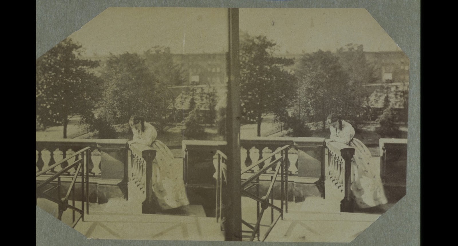 Back in London, Hawarden had less room to manoeuvre. She and her daughters could not roam about with cameras and hitched-up skirts as they did on their private lands in Tipperary. But they did nibble away at the boundaries of convention. Hawarden manipulated the codes of Victorian femininity to her own ends. Often she placed her young women deliberately on the threshold of the public spaces: in one photograph, a gate in the balustrade of the terrace has swung open. [figure 7, V&A PH.457-1968:443]