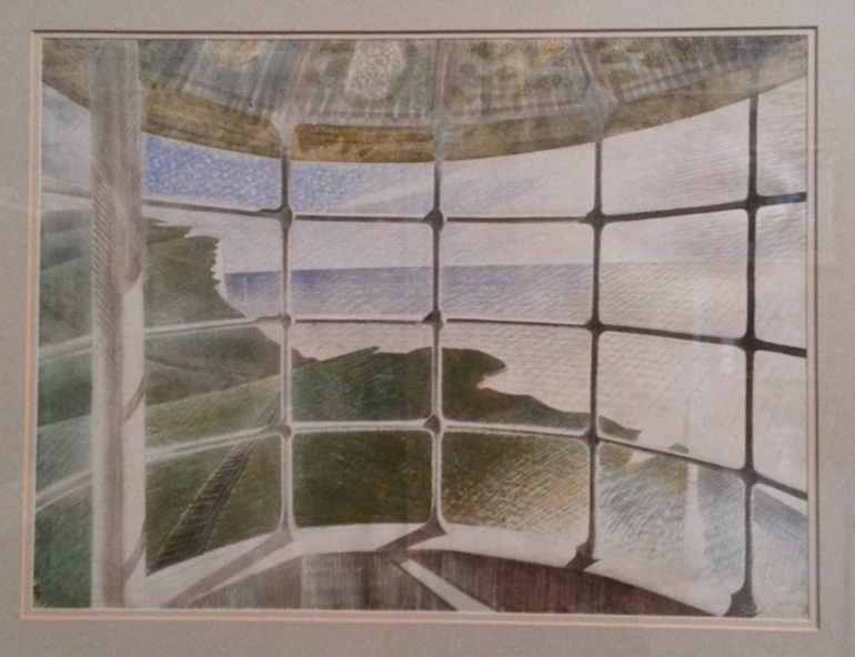 Clark oversaw a thoughtful and energetic project, encouraging modern painters to respond to the new face of combat. This was no exercise in nostalgia. And Clark did not keep his artists out of harm’s way. In Ravilious’s case, with his work for the Admiralty, his subject was the fragile edges of Britain. He painted a coastline defined by new concrete defences and curls of barbed wire, with the pleasure boats drawn up high onto the beach to sit out the war. There is the recurring motif of the lighthouse marking the intersections between land, sea and sky. Ravilious was particularly fond of the stumpy towers at Newhaven, as well as the elegant tension between curved and flat in the lighthouse at Rye. Sometimes in his paintings they shine into the darkness. More often, though, they are unlit, upright and waiting. Very occasionally, as in Belle Tout interior (1939), Ravilious shows us the view from inside the lantern, the sunlight streaming in through the window panes, almost too bright to look at. A calligraphic line dancing across the paper marks the boundary between land and sea.