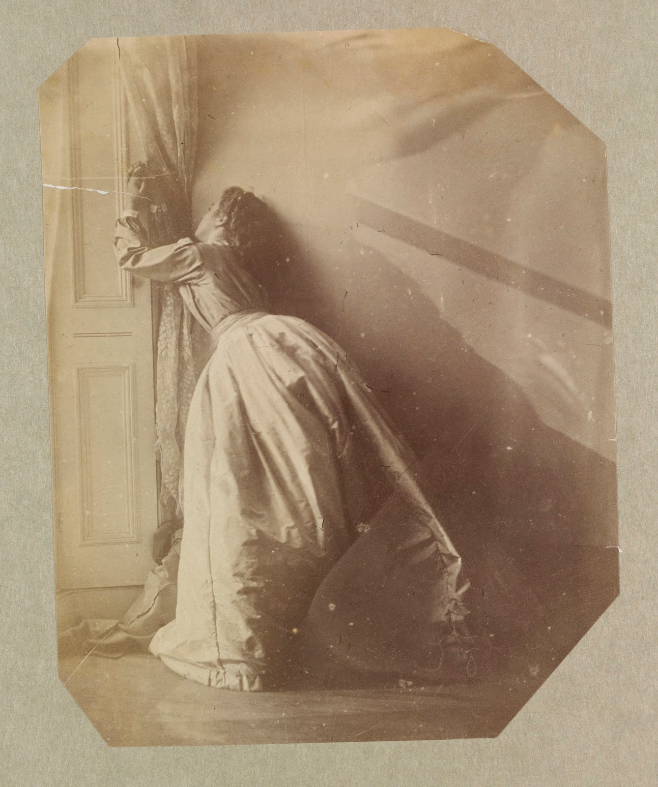 Of the two main rooms in which Hawarden took her photographs, one looked out onto the road, and the other faced the garden that was shared by the residents. The back room had sash windows and a shallow balcony, while the front room was fitted with casement windows. The family could step through these windows onto a terrace. The liminal open spaces – attached to the house, yet sunny and semi-public – became important elements in Hawarden’s compositions. Like the painters Berthe Morisot and Mary Cassatt, Hawarden discovered that the balcony and the terrace were rewarding sites for female artistic production.