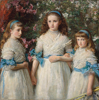 John Everett Millais completed a triple portrait of his daughters in that year. The three little girls stand in front of azalea bushes, with the pattern of petals and leaves creating a complex counterpoint to the ruffles of their matching white dresses. The colours of the flowers shade from purest white to rich pink and finally flaming orange-red above the head of Mary on the far left. They seem to suggest the different temperaments of the girls – with Mary placed in profile against the bolder tones, singled out as the unconventional one, the traveller, the independent spirit.