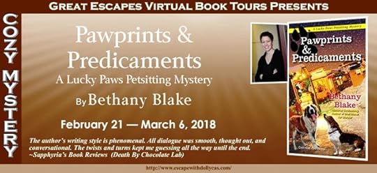 This is the third in the Lucky Paws Petsitting Mystery series. It follows DEATH BY CHOCOLATE LAB and DIAL MEOW FOR MURDER. This is my first visit to Sylvan Creek. Although part of a series, PAWPRINTS AND PREDICAMENTS can easily be read as a stand alone. Animal lovers will enjoy this book and others in the series.FTC Disclosure: I received a complimentary copy of this book in the hopes that I would post an honest review as part of this blog tour. This has not affected the content of my review in any way.