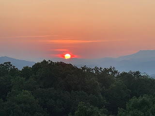 The second was romantic suspense vs. romantic mysteries. That panel included Kathleen Caraway, Lynessa Layne, me, and Gay Yellen. I just finished a book by Gay Yellen - review coming soon. Between the two conferences, my husband and I enjoyed Gatlinburg, before returning to Nashville for Bouchercon. We visited the Great Smoky Mountain State Park and stayed in a cabin near the park. This is the sunrise from our deck.
