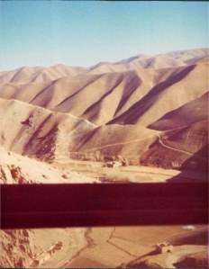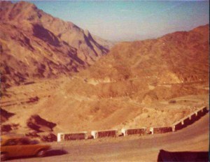Stopped at village in middle of pass (highest point of pass – Landi Kotal). Very dirty with rather tall buildings – looked unusual. Fascinating bazaar set down almost under cover and very narrow. Great hunks of dripping meat, knives sellers, deep open drains, dead rat, hashish peddlars, men with guns slung over their shoulders – Pathan country! (Disappointed that haven’t seen very many swaggering Pathans!)