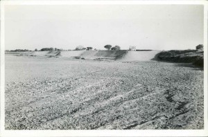 His photo shows where 'a big dam of earth and sand has been built by 14 villages each doing their share of the digging and carrying. It is to keep a river in its proper place and stop it cutting away villages and fields. It has since been planted up with a lot of trees which I had to arrange for.']