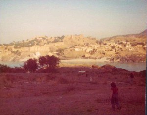 Countryside soon levelled out – real surprise and relief to see green trees and semi-green fields again – some of the scenery was really quite english. Fascinating market towns, throbbing with life and colours again. Drove late after stop for supper where locals almost fell in the stew they came so close. (Crossed Indus River by Attock Fort).”