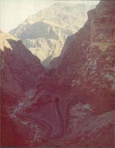 Soon left plain and into Kabul Gorge! Really spectacular cliffs and drops, tunnels and winding roads. Dizzy feeling looking up at massive rocks. Wreck of a van left at one corner as a cautionary tale.