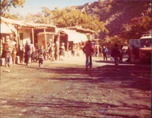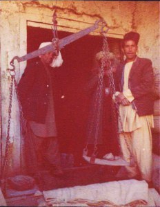 Stopped at another village further up valley and walked through it; busy workshops – meat, bread, drapers etc. Food mostly big mounds of grain and nuts. Me and Jan took “ethnic shot” of men weighing something on mansize scales!