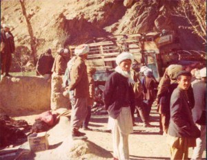 “Headed for Kabul – felt really sick. Stopped at small village – wandered up wide main street, hailed by breadmakers, so went in and saw bread being made in dark boiling room. Several of them making it; slapped loaves onto side of oven (set in the floor) and picked off before they fell into cinders. Gave us some to taste, asked for photos as usual.