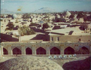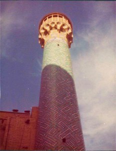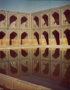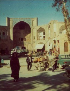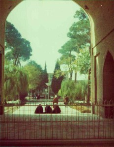 Got to SHIRAZ that afternoon – began to rain a little … tomb of famous 14th century poet (Hafez) Had a look round mosque with Heidi and Di – lovely pink flowers and designs on tiles, as well as blue and yellow. Courtyard rather overgrown, uneven and some flagstones were up. Lovely twisted columns supporting ‘Winter’ courtyard (covered over) with narrow tank in middle. Some men were washing at little taps along side of tank and others were sitting chatting on mats under some scaffolding …