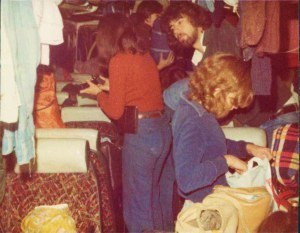 ” Lie in !!! (10 o’clock). Had leisurely breakfast at Metropole after taking 1 and half hours to get up. Lovely omlette and chips. Had mad time in clothes shop looking at embroidered waistcoats and tops – in one shop about 6 of us had half the stock out to try on – turned shop upside down – I bought a gold velvet dress!
