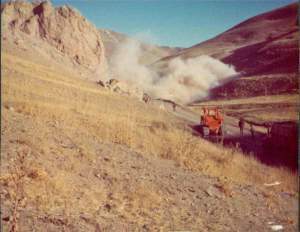 Road blocked because of blasting – one blast, then we gathered to take pictures of 2nd go. Made us all move back – general chaos. Little man climbing about on rocks, no one seemed to take much notice. Had to wait after blast for bulldozers to move in; then followed sheep trucks etc over rickety new road.