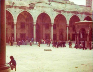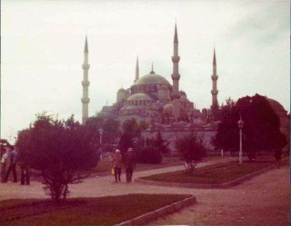 “Hot shower! Porridge in the kitchen. Dropped at the Blue Mosque – people bombed in on the bus with bread, pcs and shoe cleaning boxes! Jan, Rob and me went to the Blue Mosque. At the inner courtyard we took off our shoes and went in under a leather curtain. Lovely inside – blue tiled mosaics – 4 main pillars (called elephants’ feet) with arches and semi arches. Turkish carpets covering all floor, with wooden trays for extra shoes. Two taps on wall for drinking water from Mecca – guide zoomed up and told me to drink, but couldn’t get anything to come out!