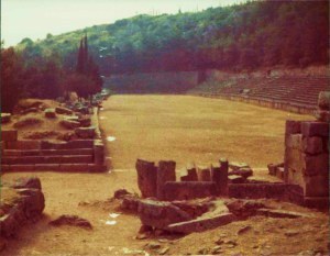 Made my sacrifice of 30 drachma (i.e. full price) and went in. Got in on bad tour, woman couldn’t find the baize of the tripod! Saw Temple of Apollo and amphitheatre. Decided to climb even further to see the Stadium – went up dusty windy path, cheap of birds, disturbed a few pigeons. Reached Stadium, really high up and hidden among trees. FANTASTIC sight, just me and the gods up there, could almost see the chariot tracks in the dust. A gust of wind in the trees sounded like the murmur of the crowd! All the seats around one side of the stadium still well preserved; big square pillars at one end. (Went to the loo looking down over the stadium – what a boast!) Fantastic view of the mountains looking down from the top.