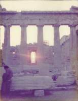 Made way up narrow lanes to Acropolis, kept losing everybody. While at Acropolis most tourists were leaving and sun going down between the pillars of the Parthenon, hazy view out to sea. View of Temple of Zeus and other hill (Athens not an attractive city – much of it dug up and half built, very dirty). Guards and band appeared and played while flag lowered. Men blew whistles frantically when anyone tried to go inside Parthenon. One attendant gave us a pollo; another called Jan Athena, me Aphrodite and Rob Zeus! All seem very friendly.