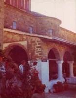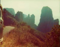 Made inland – detour to trip. Suddenly left plain and huge rocks and cliffs appeared - very dramatic scenery. Convents perched really high up on these cliffs, amazing sight [Monasteria of Meteora]. Climbed up road and stopped at Convent of St Stephen – had a look round – not allowed in unless wearing a dress and arms covered. Let in across drawbridge – nuns almost totally covered in black. Small courtyard inside – orphanage made up one side – no signs of kids until just leaving, then little faces appeared from a window. View out over small town at foot of cliff-face and hazy blue horizon of plain – quite hot.