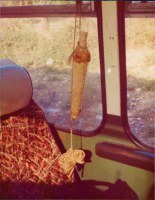 Fred hung corn on the cob above table[on bus] – health hazard with flies.