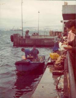 At the quayside we bought fish and bread from a little bobbing boat, with a charcoal fire (looked hightly dangerous!) Lined up by the rails were salt cellars and a bowl of garlic to be taken with the fish.
