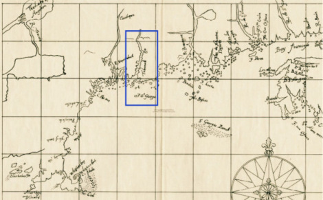 A copy of a copy of the 1610 Simancas (Spain) archive map. Waymouth’s explorations are in the area o...