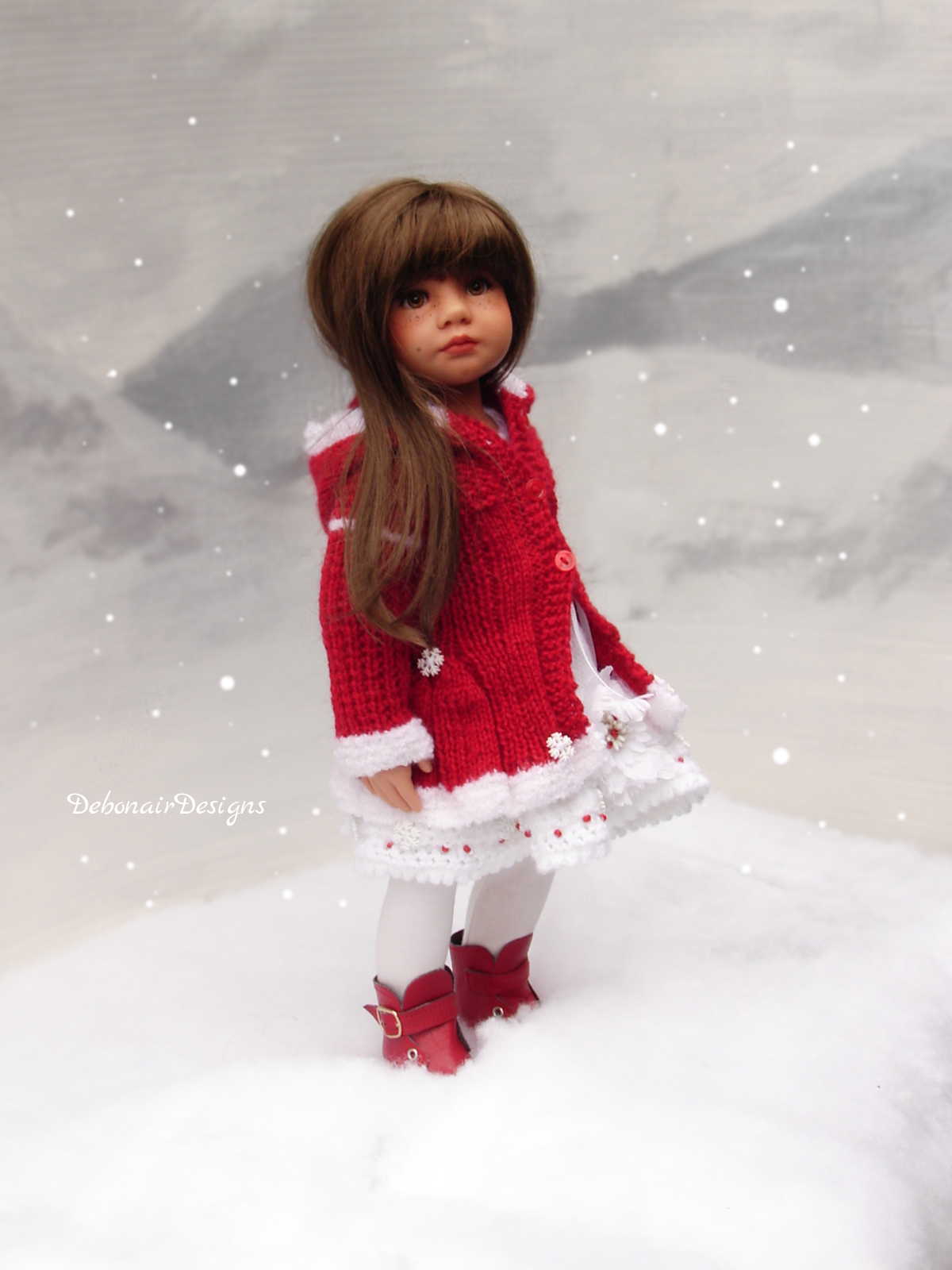 Home for the Holidays as depicted in volume two of  Kalendar Kidz Vol. 2  with minor changes like working a textured white trim, adding a hood and pairing with a dress for a finishing touch