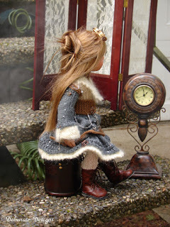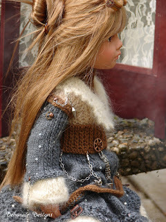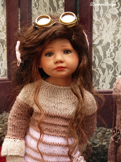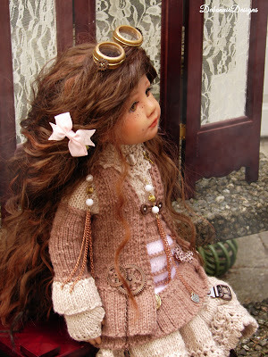 Continuing the themes as depicted in volume one of  Kalendar Kidz I worked the 'City Chic' patterns, featuring 'Bon-Bon' tunic dress paired with the vest, Je t'aime, in a theme I thought suitable for February's Valentine's Day, in a unique Steampunk style with a touch of romance, paired the dress with my petticoat pattern, 'Three Steps'  . . . my slim customized Gotz Happy Kidz model has a newer wig in the form on a long, wavy one with highlights, perfect for this occasion