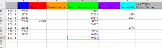 I may have gotten a little OCD in my word count tracking. I was playing with my spreadsheets and I realized that I am writing an average of 2200 words a day. Some days it even goes as high as 6000 words a day but those days are rare.