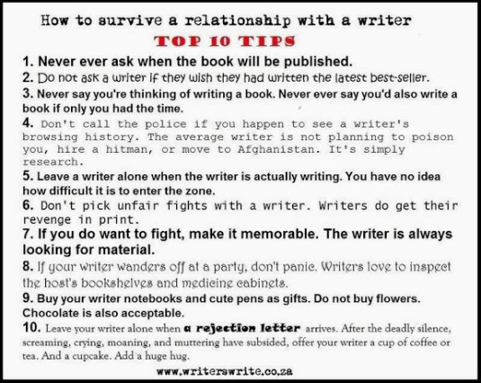 10. Writers are human, just like everyone else. When a character dies in a novel they are reading or writing they can be overwhelmed with sadness and grieve the loss of their mental companion. Give them time to recover from the shock.