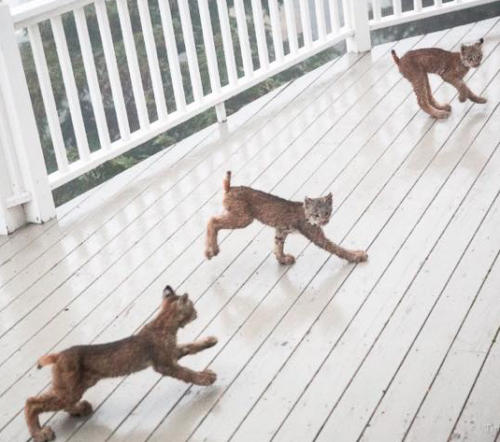 “Tim was awakened by noises on our deck last week - and looked outside. In astonishment, he grabbed his camera.. and can you believe it? Mama Lynx and her SEVEN kits!! She called to them and they all lined up right outside in front of where he was standing (he was inside the screen door!) Amazing ALASKA WILD LIFE!!! They proceeded to run and play on our deck, and then in our yard.”