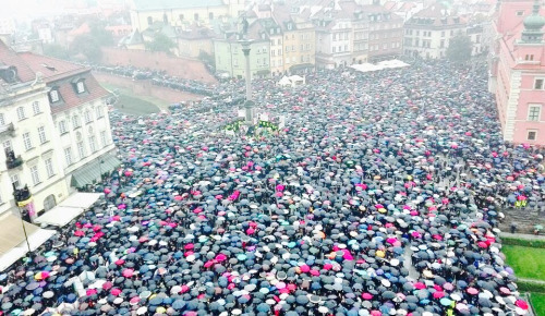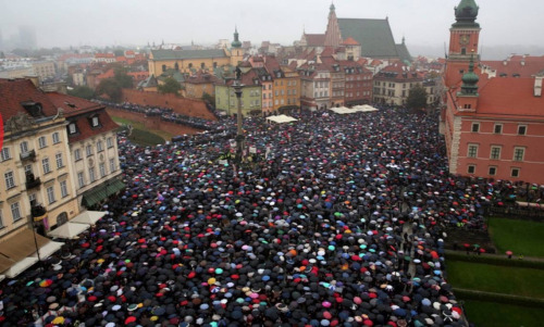 Thousands of people, chanting, singing, and carrying pro-choice signs, gathered in Castle Square in the Old Town and marched across the city towards the Parliament buildings, despite the heavy rain. Protests and marches were organised in all major Polish cities, as well as smaller towns and villages. An estimated 6 million women took part in today’s strike, refusing to come into work and schools.