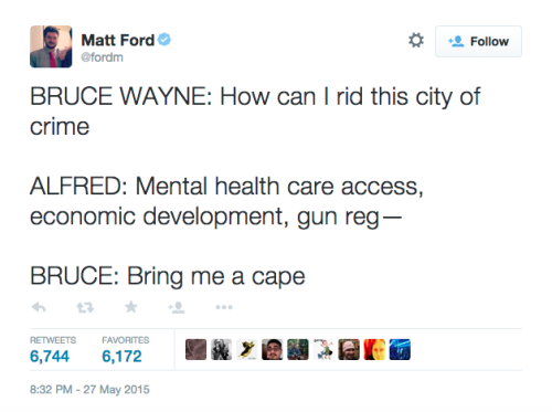 BRUCE: I’ve created jobs by keeping Wayne Enterprises in Gotham. I’ve provided scholarships to every employee of my company and I offer them to others as well. I’ve built orphanages and hospitals, including mental health facilities. I’ve provided jobs to ex-felons right out of prison so they can rebuild their lives. I’ve supported pro-reform political candidates and the few honest cops in Gotham City.