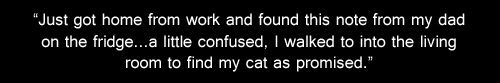 Let us just appreciate that this person’s dad didn’t know when they would be home and so he couldn’t plan for them to be able to join the family for dinner, but he knew with no doubts that dear sweet Meatloaf staying in that exact position for hours was an absolute in this scenario. Truly, that cat was named well.