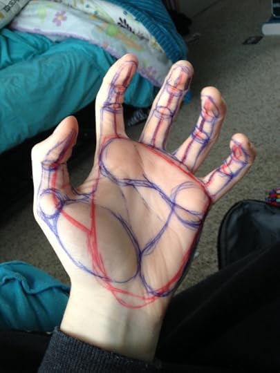 I always struggled drawing hands before anyone told me what to do. So here is a HANDy dandy drawing reference to see the steps on an actual hand. There are three big muscles in the palm. The thumb lump is most important because without it you’ll never even get the shape right. Circle up the knuckles and draw bendy lines (red) to connect them. Make sure the fingers go from medium-tall-short-shortest just slightly (index=>pinky finger). Notice the big red squareish shape around the palm-that’s the first thing I do. Note: every infer has 2 knuckles don’t forget the thumb does too…just in a weird way.