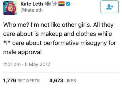 [Tweet from Kate Leth @kateleth: “Who me? I’m not like other girls. All they care about is makeup and clothes while *I* care about performative misogyny for male approval” 5 May 2017]