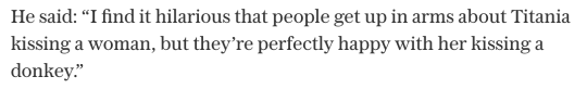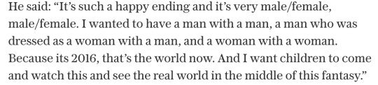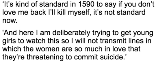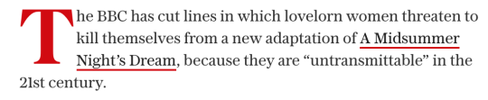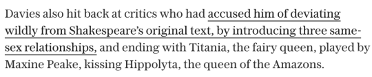 [image description: screencap #1: The BBC has cut lines in which lovelorn women threaten to kill themselves from a new adaptation of A Midsummer Night’s Dream, because they are “untransmittable” in the 21st century.“ Screencap #2: ”‘It’s kind of standard in 1590 to say if you don’t love me back I’ll kill myself, it’s not standard now. And here I am deliberately trying to get young girls to watch this so I will not transmit lines in which the women are so much in love that they’re threatening to commit suicide.’“ Screencap #3: Davies also hit back at critics who had accused him of deviating wildly from Shakespeare’s original text, by introducing three same-sex relationships, and ending with Titania, the fairy queen, played by Maxine Peake, kissing Hippolyta, the queen of the Amazons. / He said: ‘It’s such a happy ending and it’s very male/female, male/female. I wanted to have a man with a man, a man who was dressed as a woman with a man, and a woman with a woman. Because it’s 2016, that’s the world now. And I want children to come and watch this and see the real world in the middle of this fantasy.’” Last screencap: “He said: ‘I find it hilarious that people get up in arms about Titania kissing a woman, but they’re perfectly happy with her kissing a donkey.’”]