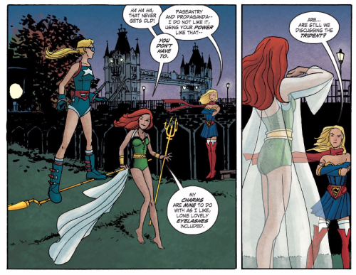 Wonder Woman is standing up for prisoners of war and doing the hard ugly parts that people don’t talk about. She’s showing compassion to her enemies and saving lives. Kate Kane’s ex-girlfriend Renee was a rebel fighter in the Spanish Civil War and her current is chief of police in Gotham. Catwoman is a bored Italian Baroness manipulating society for ‘good’. Stargirl and Supergirl are sisters, growing up together and growing stronger for it. Mera is just fun. Waller is in control and is as she should always be in all respects. Zatanna is of mixed Jewish and Romani heritage.