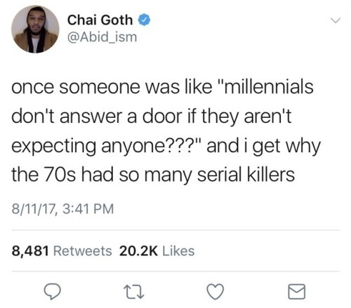Now I can’t help but imagine a 60 year old seriel killer at a millenials door waiting, mad as fuck, checking his watch , and leaving out of frustration and writes a blog post about how millenials are ruining this country