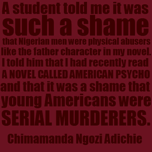 4. A student told me it was such a shame the Nigerian men were physical abusers like the father character in my novel. I told him that I had recently read a novel called American Psycho and that it was a shame that young americans were serial murderers.