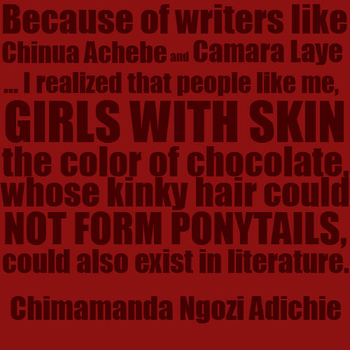 9. Because of writers like Chinua Achebe and Camara Laye…I realized that people like me, girls with skin the color of chocolate, who’s kinky hair could not form ponytails, could also exist in literature.