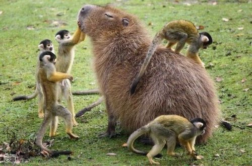 if ur feeling sad, look at this capybara; he’s just happy to be friends with everyone